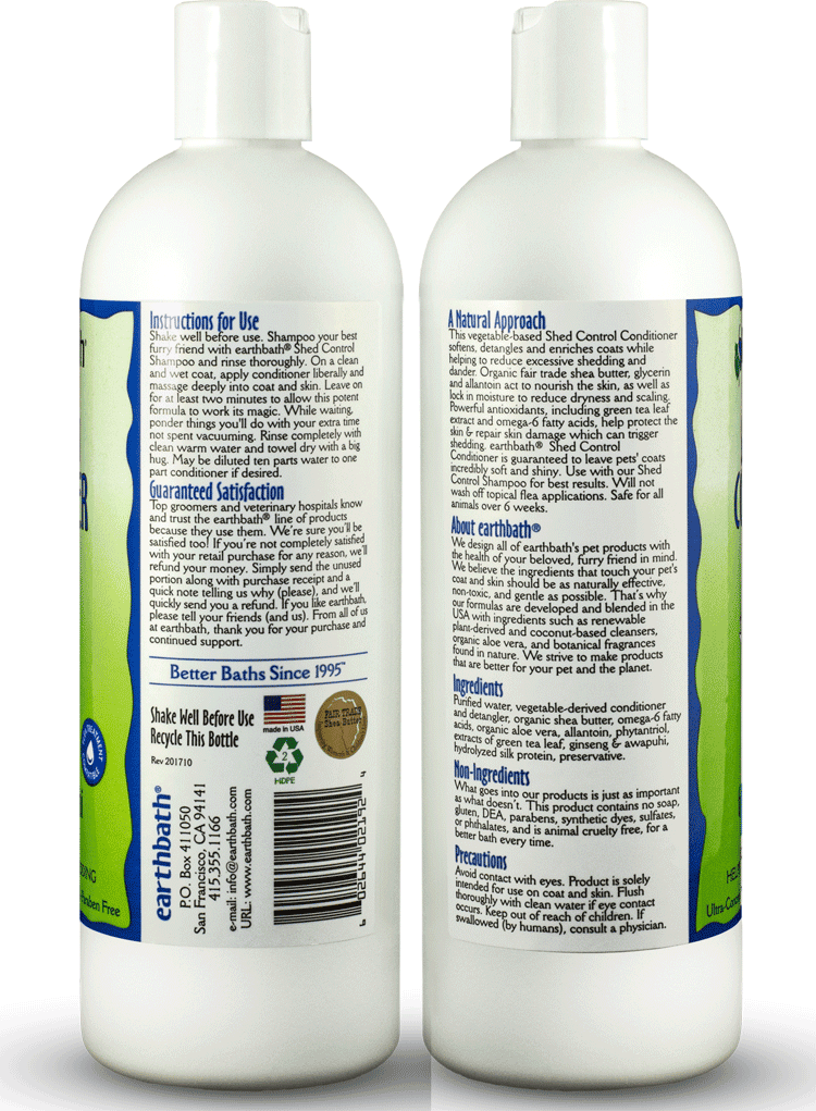 This vegetable-based Shed Control Conditioner softens, detangles and enriches coats while helping to reduce excessive shedding and dander. Organic fair trade shea butter, glycerin and allantoin helps to nourish the skin and lock in moisture to reduce dryness and scaling. Antioxidants, including green tea leaf extract and omega-6 fatty acids, help protect the skin & repair skin damage which can trigger shedding. Earthbath Shed Control Conditioner is guaranteed to leave pets' coats incredibly soft and shiny. Use with our Shed Control Shampoo for best results. Will not wash off topical flea applications. Safe for all animals over 6 weeks.